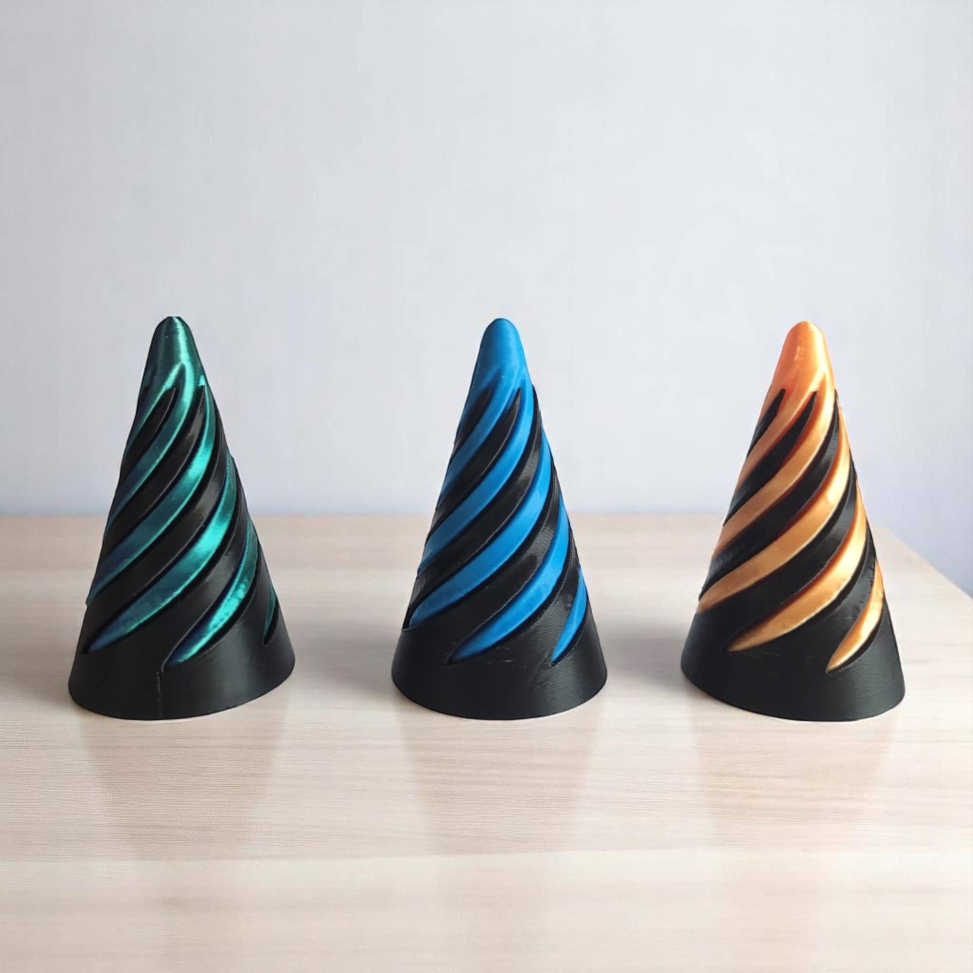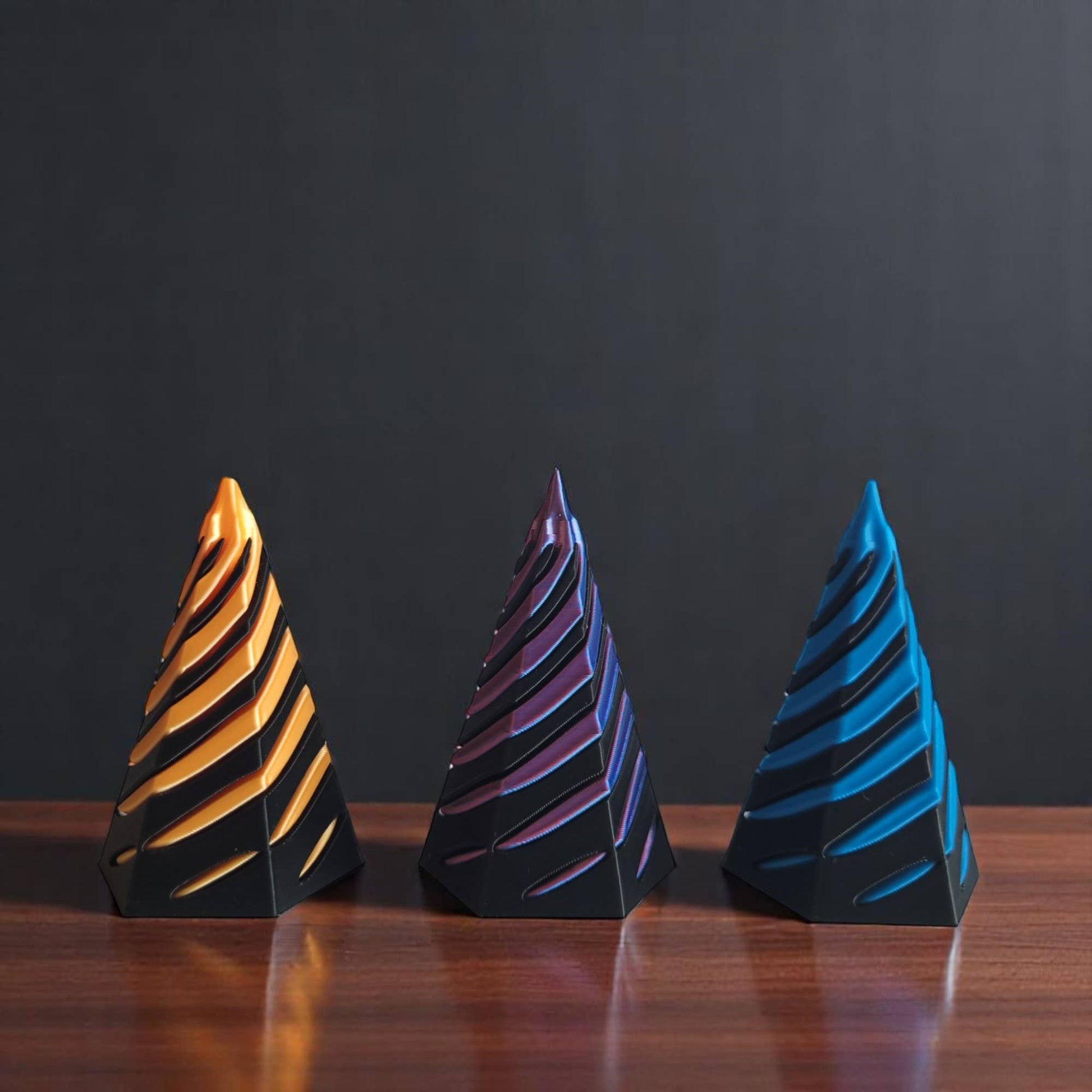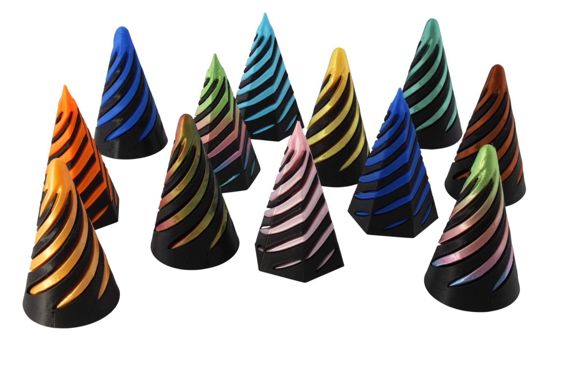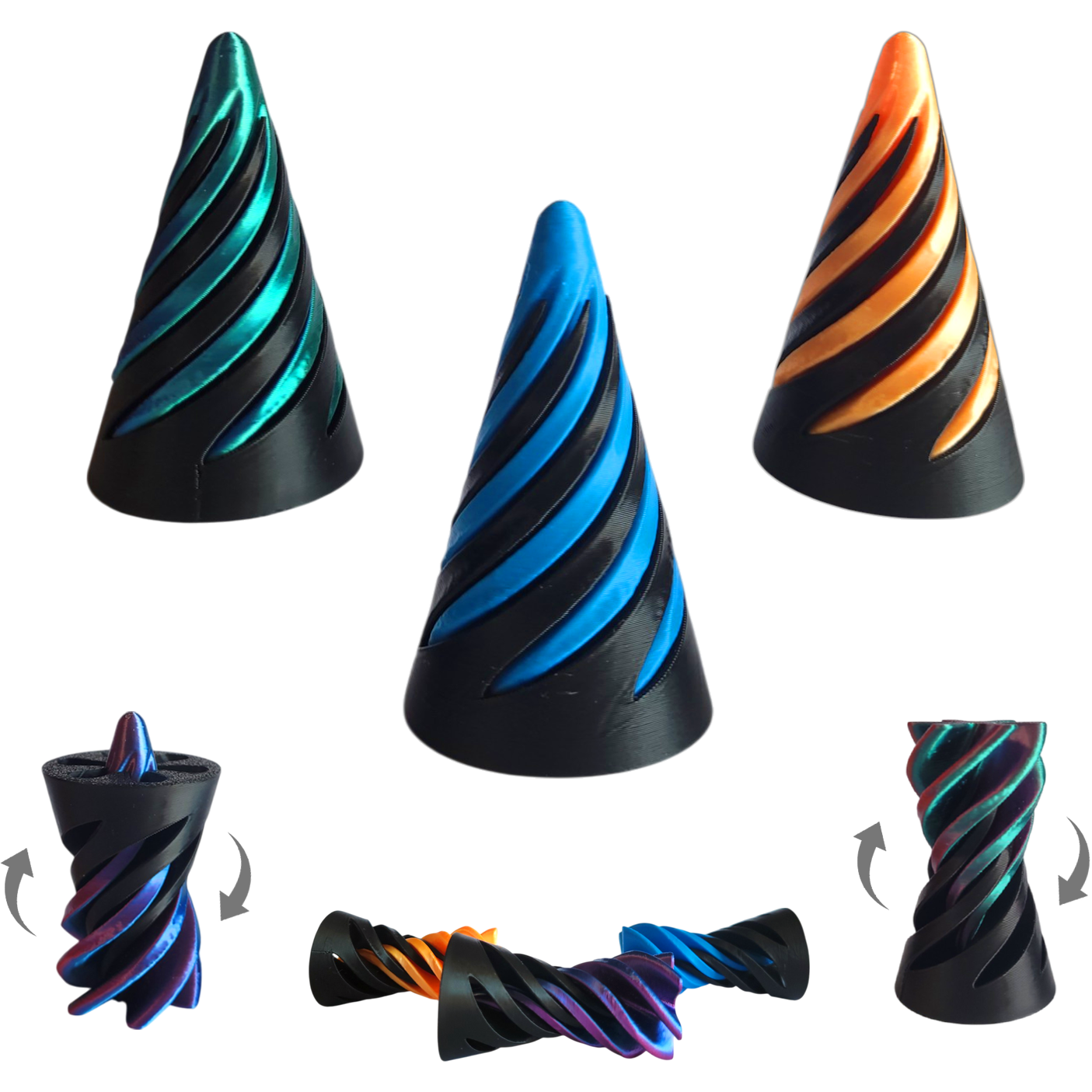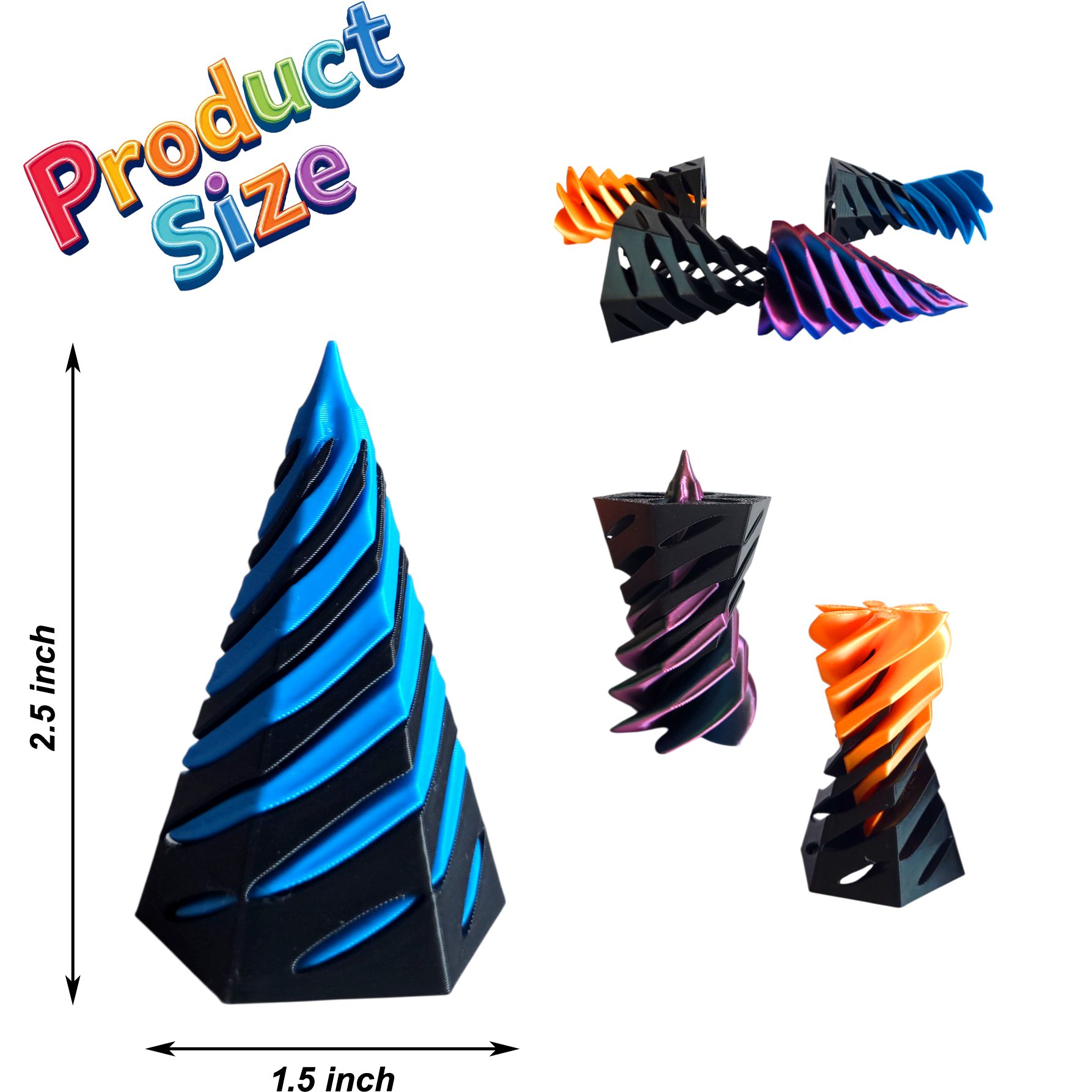 Bring a bit of wonder to any desk or classroom with this mixed set of optical-illusion fidgets. Each piece features a precision-printed “impossible passthrough” ring that appears to pass through the center—an eye-catching trick made possible by clever geometry and high-quality 3D printing. What’s included 12 pieces per case: 6 cones + 6 pyramids Assorted colors (a lively mix that may include solids and tri-color blends) Approx. size: ~2.5 inches tall each Material: PLA • Smooth, durable finish Great for desk décor, fidgeting, or gifting to fans of illusions and clever designs. Lightweight yet durable, these pieces are printed with PLA and offer a smooth finish and satisfying feel in your hand. Whether you're displaying them or puzzling over the mystery, they’re sure to impress! ✨ Size: Each piece measures approx. 2.5 inches tall 🎁 Made in USA